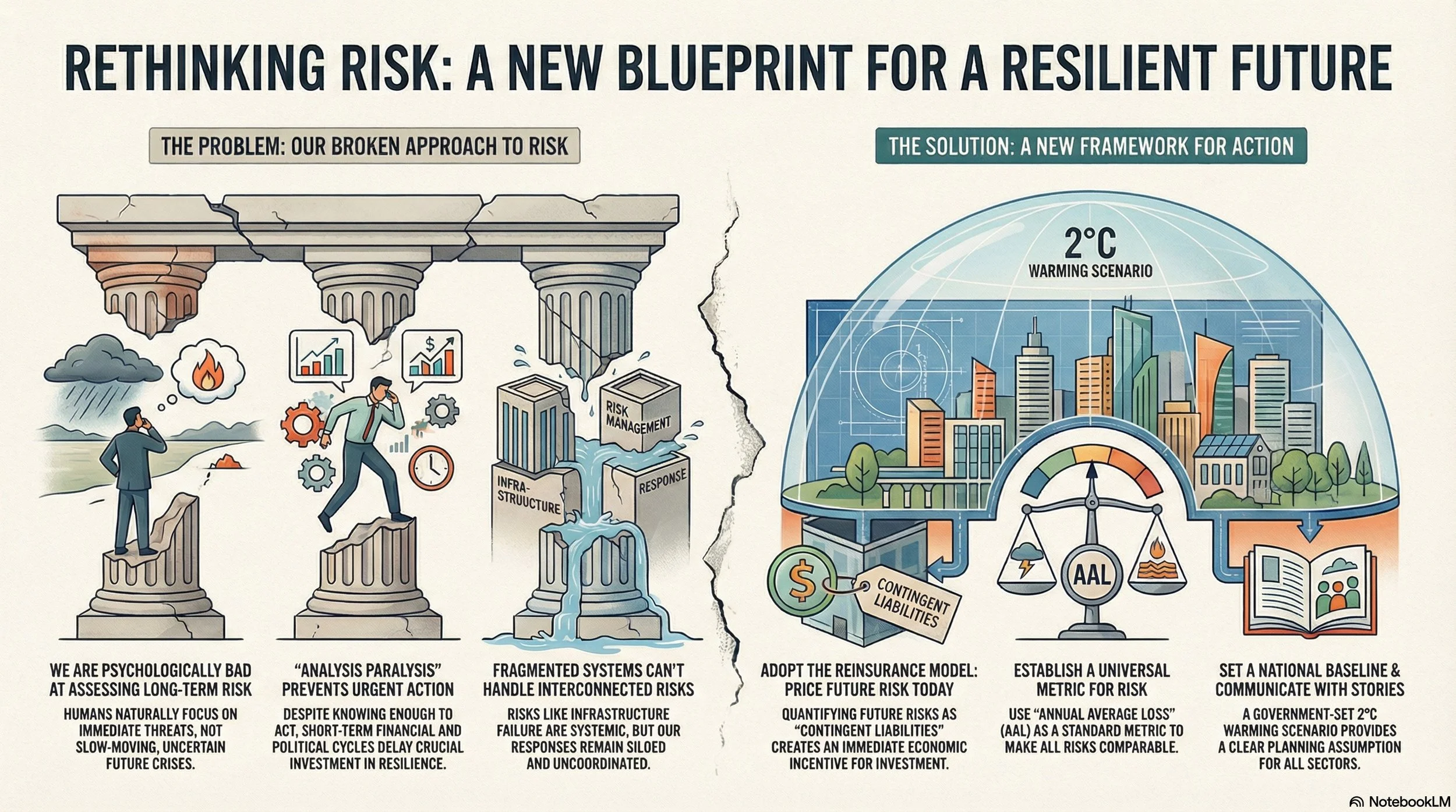 This report examines the urgent necessity of addressing long-term environmental risks within the built environment and national infrastructure. It contrasts acute risks, like sudden disasters, with chronic risks, such as climate change, emphasizing that persistent threats require a systems-based approach and new design standards. A significant portion of the discussion explores how the reinsurance sector uses catastrophe modelling and "annual average loss" metrics to put a financial price on vulnerability, potentially catalysing investment in resilience. The text advocates for improved communication to bridge the gap between public perception and scientific reality, suggesting that localized storytelling is more effective than abstract data. Ultimately, the sources call for a unified 2°C baseline scenario to guide government policy and professional training, ensuring that mitigation and adaptation strategies are implemented in tandem.